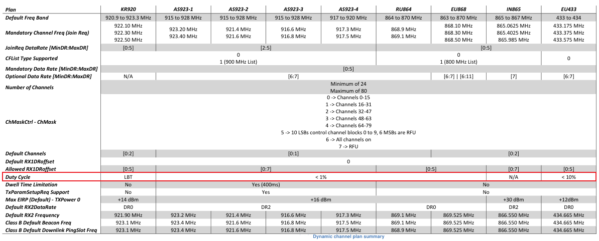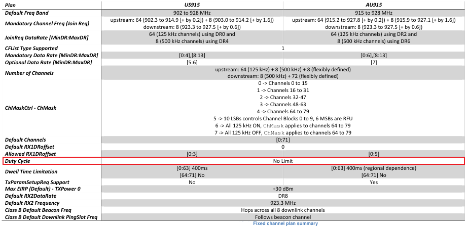参考《RP002-1.0.4 LoRaWAN® Regional Parameters》1.3 Regional Parameters Summary Tables